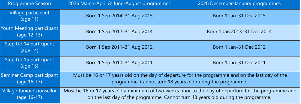 Kansainvälisten leirien ikärajat vuodelle 2026